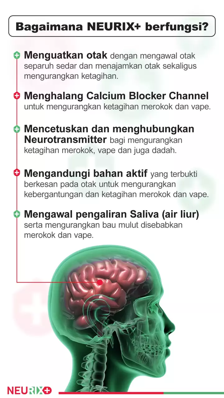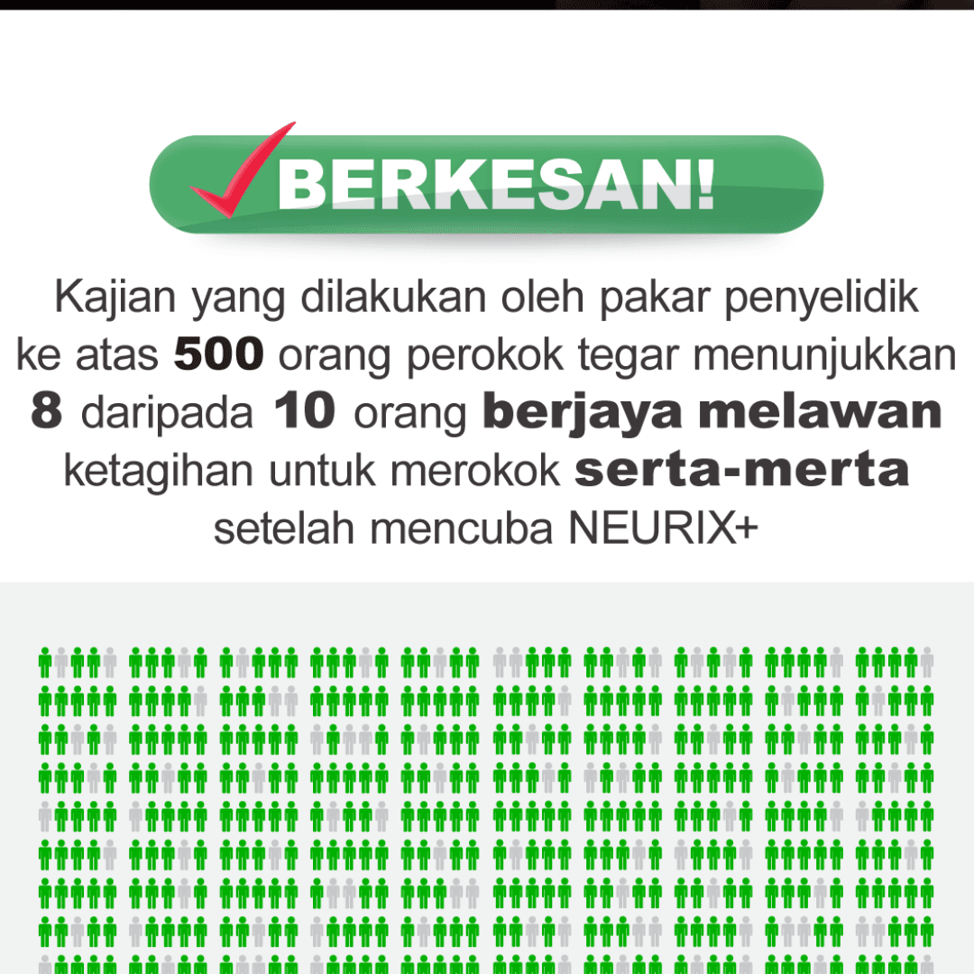 Tidak seperti sesetengah produk berhenti merokok lain yang membekalkan nikotin sebagai ganti kepada rokok/vape, Neurix+ merangsang dan menyokong otak supaya mampu mengawal ketagihan terhadap nikotin dengan lebih baik. Ia tidak mengandungi Nikotin. It’s a NICOTINE FREE product.