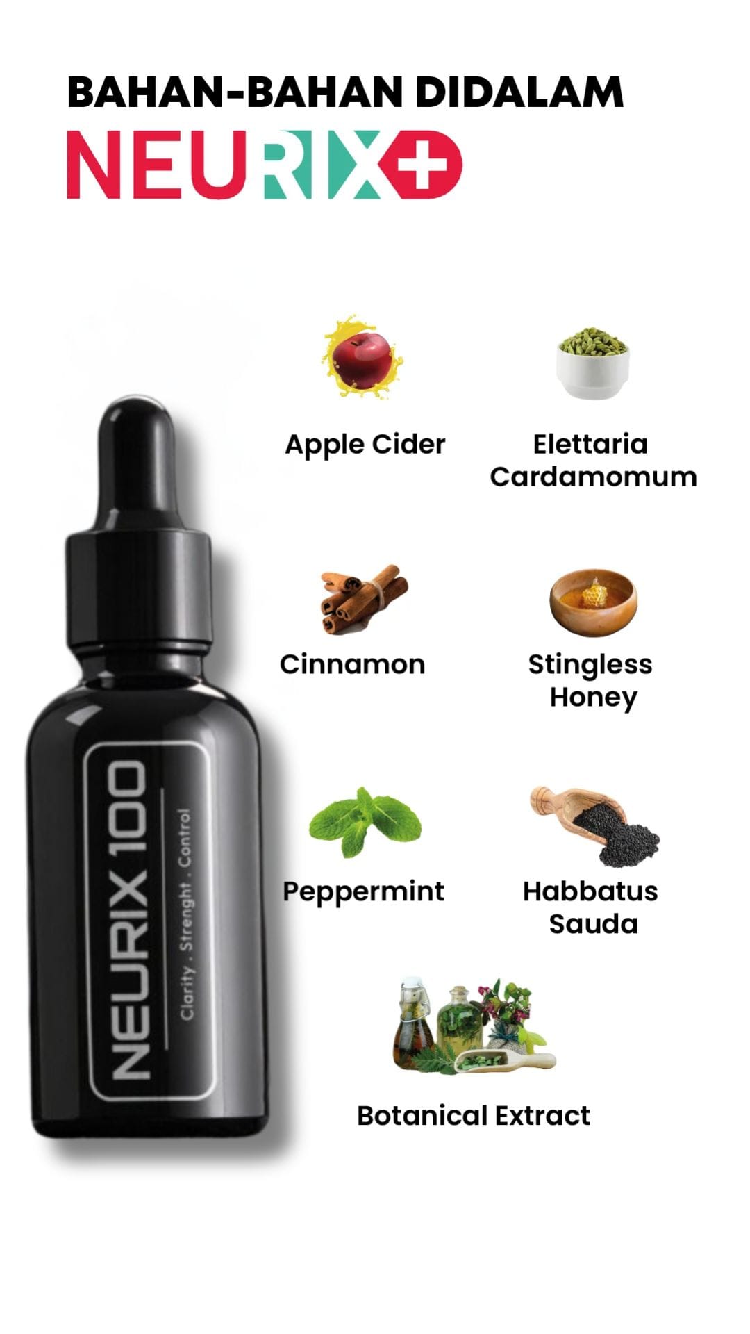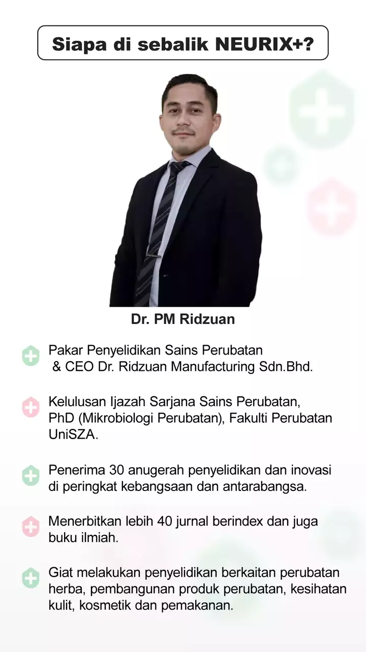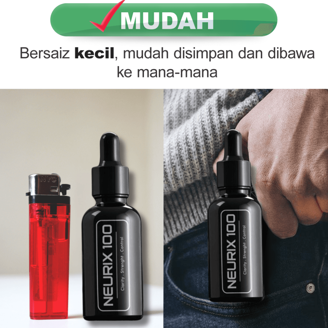 Saiz 1 unit Neurix+ ialah 24mm x 91mm, manakala isipadunya ialah 10ml.