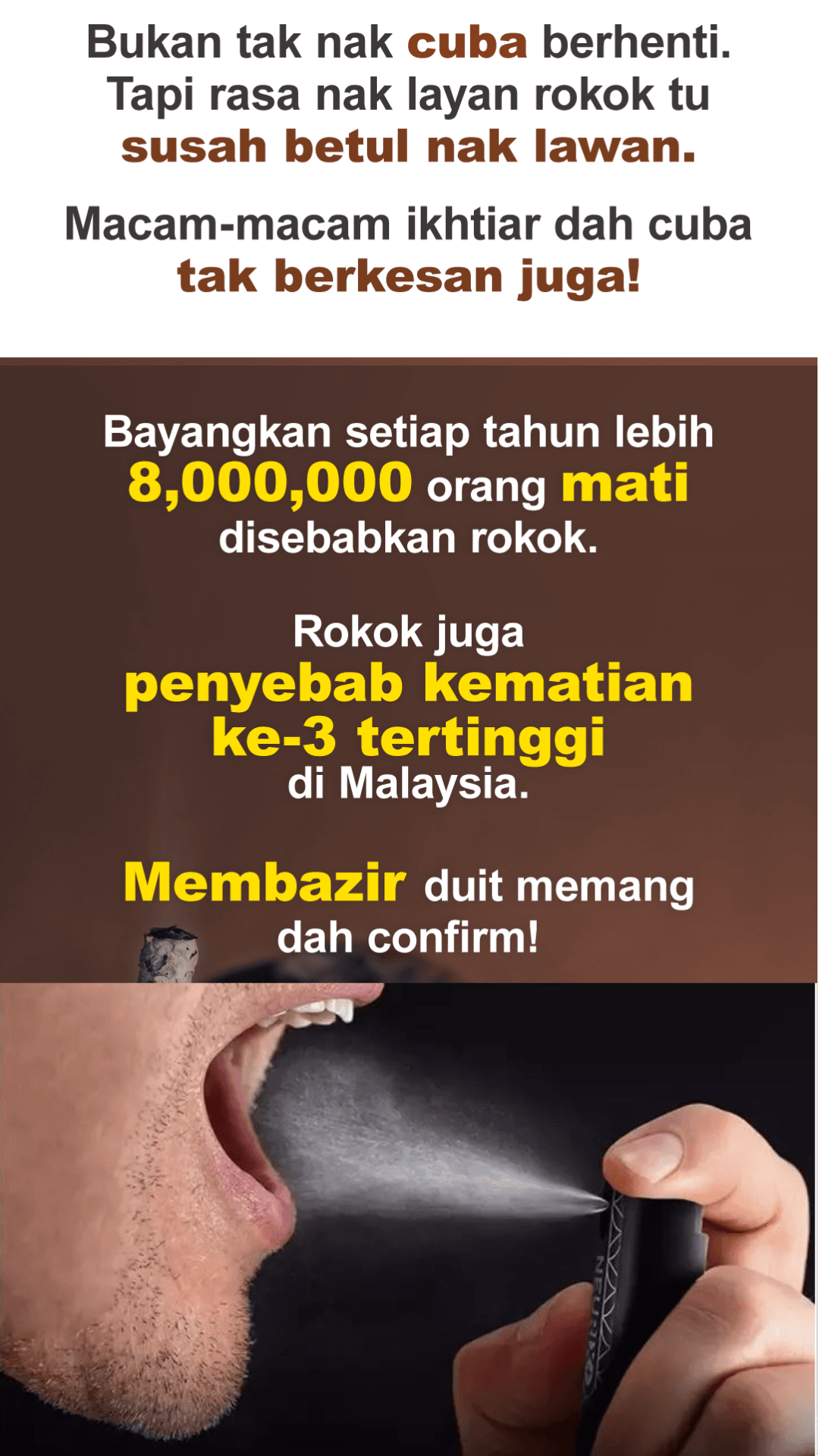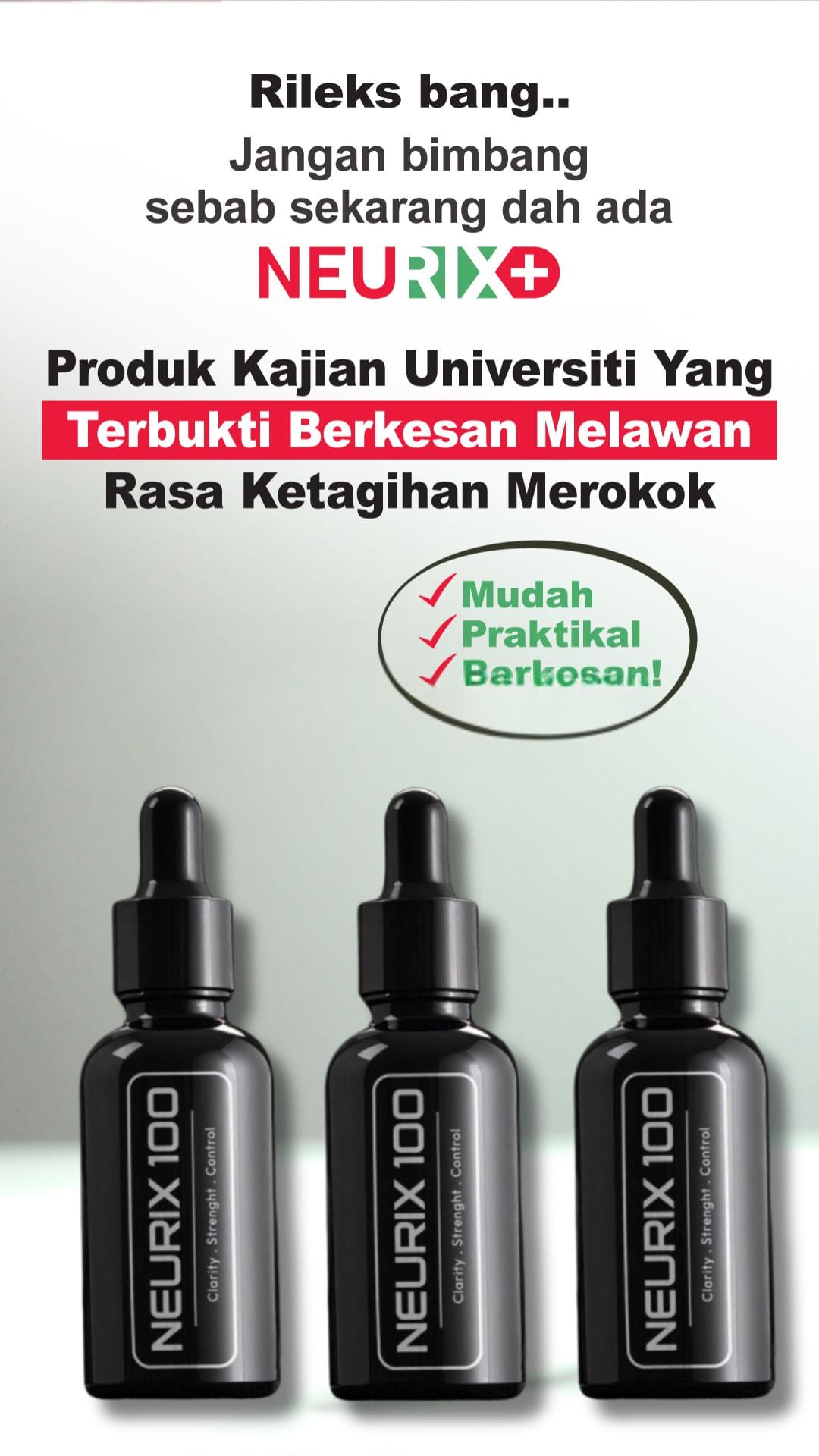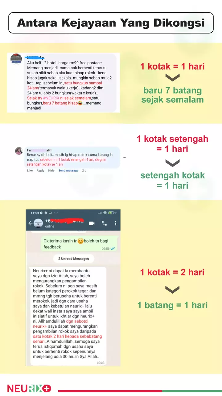 1 unit Nuerix+ boleh bertahan sehingga lebih 80 kali semburan. Jika 1 semburan boleh menjimatkan duit untuk membeli 1 batang rokok, abang boleh ‘skip’ 80 batang rokok dengan hanya 1 unit Nuerix+. Tahniah!